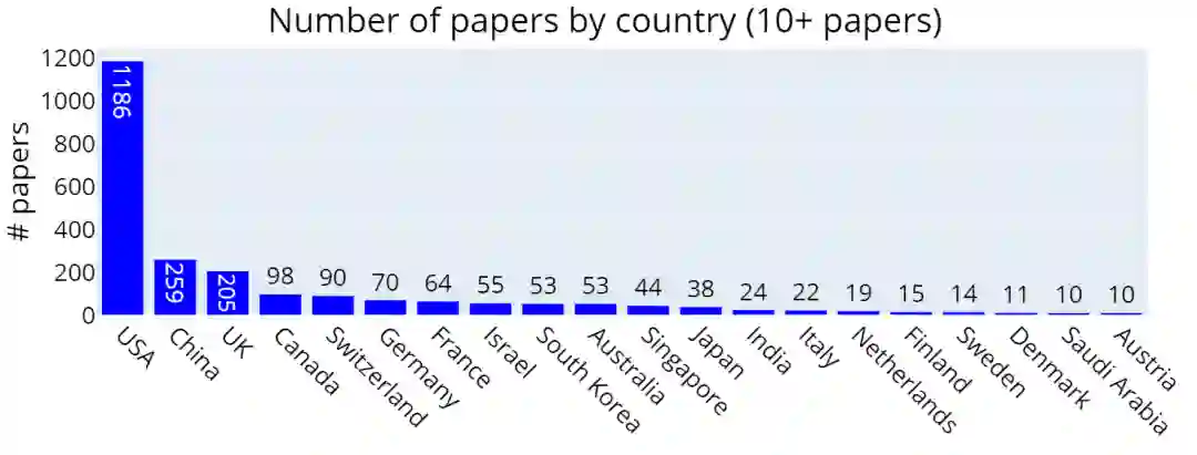 现在让我们考虑一下不同国家的表现。我将机构总部所在国家作为论文从属的国家。虽然这可能会将个别论文归于“错误的”国家,但类似于ICML 2020的分析,结果应该非常接近现实(由于大学关联的是单个国家,而大学发表的论文远远多于企业)。