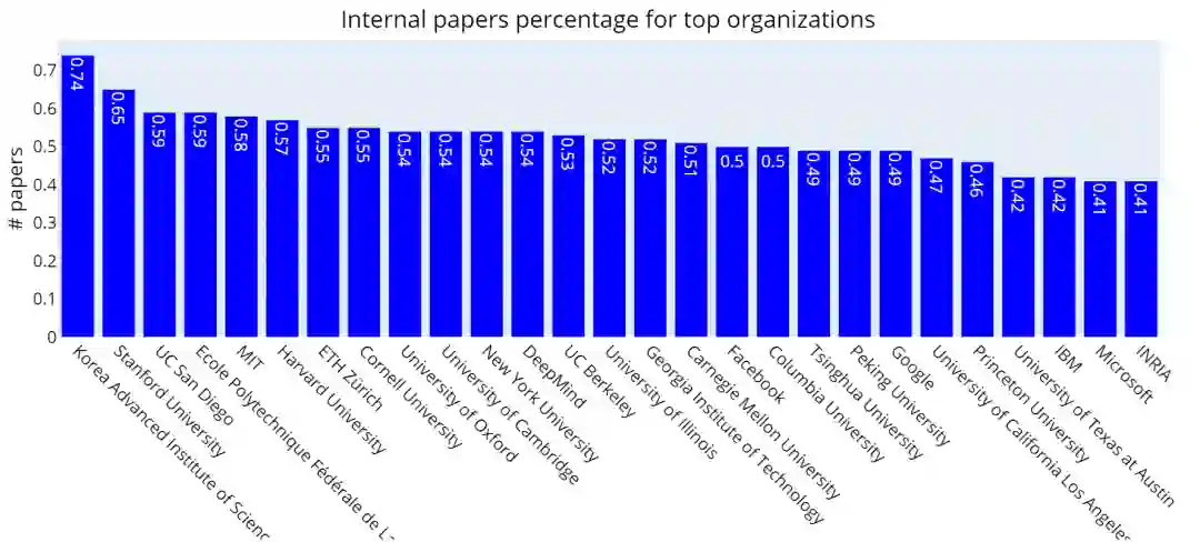 的内部协作量相差很大:从KAIST的74%(KAIST的每篇论文大约有四分之三的作者来自KAIST)到Microsoft的41%。