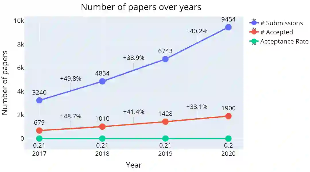 尽管提交的论文数量不断增加,但接受率仍然保持在很稳定的水平。