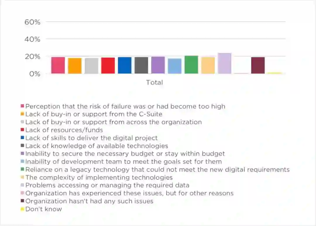 然而,转型过程依旧十分艰难。2021 年,82% 的企业无法开展数字化转型项目,80% 的企业出现项目失败、延期或缩减的情况。虽然其中一些问题可能是由于疫情加剧的外部因素造成的,但许多问题是由于对遗留技术的依赖,或由于访问或管理相关数据的问题造成的。