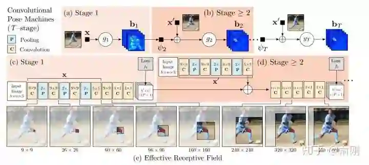 后续2D的人体姿态估计方法几乎都是围绕heatmap这种形式来做的(3D姿态估计将会是另外一条路),通过使用神经网络来获得更好的feature representation,同时把关键点的空间位置关系隐式的encode在heatmap中,进行学习。大部分的方法区别在于网络设计的细节。先从CPM开始说起。
