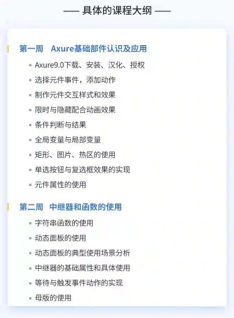 Axure实战班安排了6次直播课,老师会在直播课上讲解更多的交互和产品设计。让你在学Axure的同时,培养对产品的理解,对交互的感觉