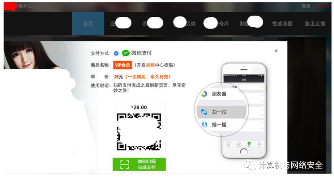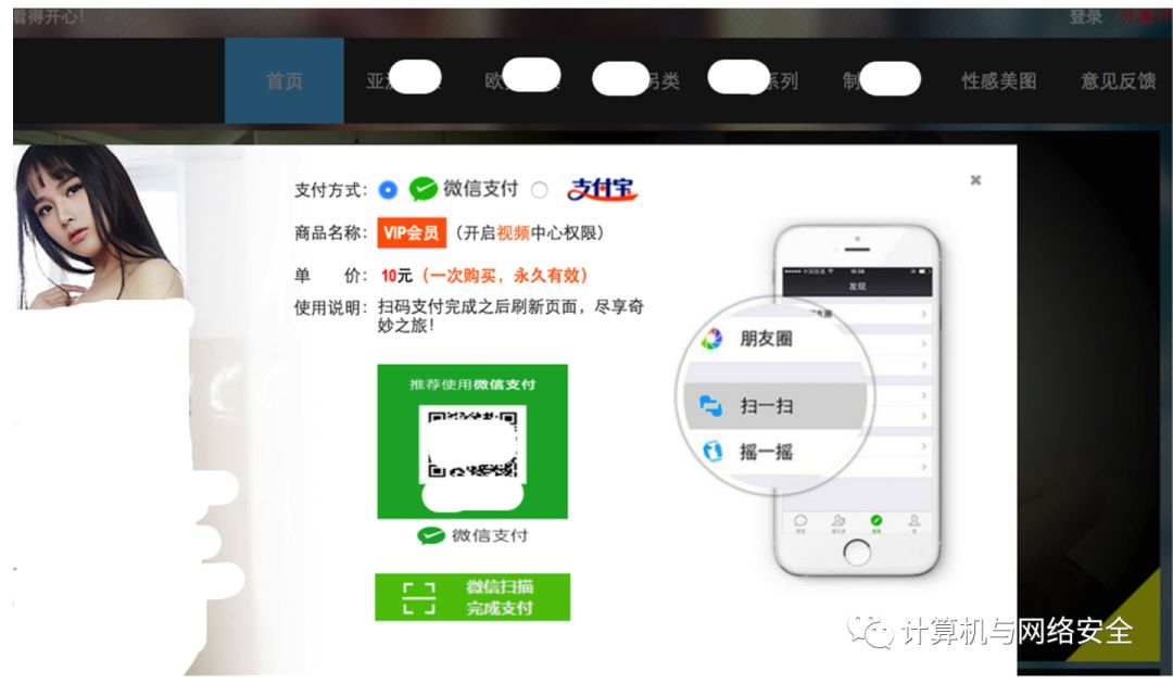 哟,现在的'se'情'网站,用户体验做的这么好?还搭上了移动支付的列车,都能微信和支付宝支付了。从产品的角度上看,这个诱导支付做的还可以,无论是点击视频弹框,还是点击网站右上角[开通VIP]这个按钮,每次都能弹出不同的诱惑图片,并且价格非常"亲民",大体都是十几二十块这样子。