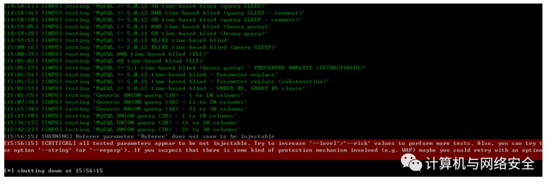 这里收集了不同网站的一批注入点,然后我们拿神器SQLmap出来溜一圈。不同网站防护情况不同(例如安装了waf),注入的效果是不同的,不能一条指令走到黑,需要调整注入的参数,例如是否加长时间延迟、是否采用随机头部、是否加大注入级别。按照这个思路,大概需要用到这些指令: