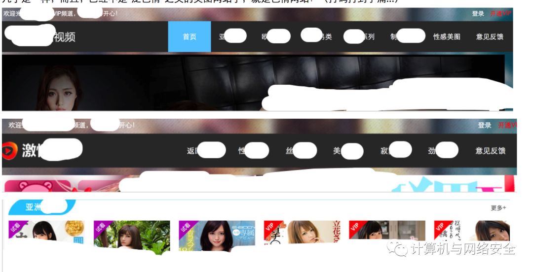 为了一探究竟,便依次点击不同网站上面这些弹框图片,之后便跳转到对应的网站,此时发现这事儿越发有点蹊跷,这些网站除了域名,整个布局几乎是一样,而且,已经不是"泛色情"之类的美图网站了,就是色情网站!(打码打到手痛...)