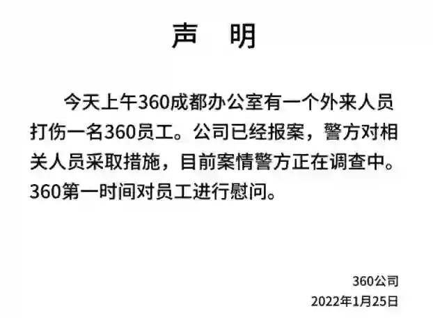 1月25日,@360公司 微博发布声明称,今天上午360成都办公室有一个外来人员打伤一名360员工。公司已经报案,警方对相关人员采取措施,目前案情警方正在调查中。360第一时间对员工进行慰问。早些时候,@360公司 微博发布回应称,一切案情相关以警方通报为准。360谴责一切恶意伤人行为,并即刻配合警方和医院对受伤员工展开救治和慰问。