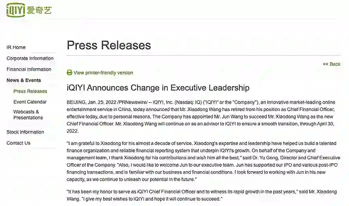 1 月 25 日晚间,爱奇艺宣布,王晓东由于个人原因从公司首席财务官一职上退休,今日生效。公司已任命汪骏担任新任首席财务官。王晓东将继续以顾问身份服务至 2022 年 4 月 30 日。