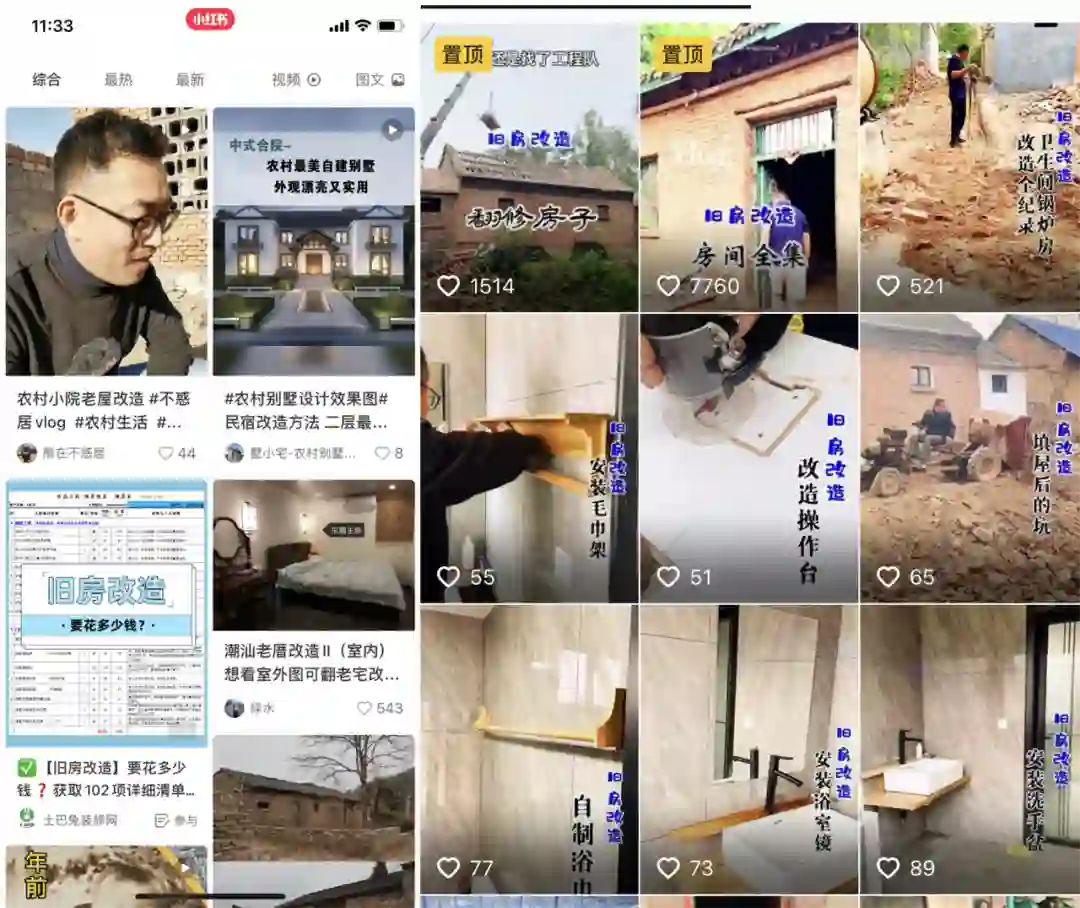 在抖音上,关于#老房子改造#的话题播放量直接上亿,小红书关于“改造”的笔记超过143万篇。