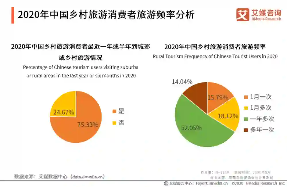 据艾媒咨询数据显示,2020年中国旅游用户最近一年或半年到城郊或省内乡村旅游的比例达七成,五成以上旅游用户一年多次到乡村旅游,18.12%的旅游用户1月多次到乡村旅游。