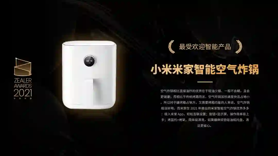 空气炸锅相比直接油炸的优势在于轻油少烟、一般不会糊,且会更健康;而相比于传统烤箱而言,空气炸锅加热速度快且占地小。所以对于嫌烤箱占地方,又需要烤箱功能的人来说,空气炸锅相当好用。而米家在 2021 年推出的米家智能空气炸锅优势多多:接入米家 App,轻松互联设置;旋钮+显示屏,操作简单易上手;烤篮托+烤架,简单易清洗,如果嫌麻烦垫硅油纸托盘,清洁更省心。
