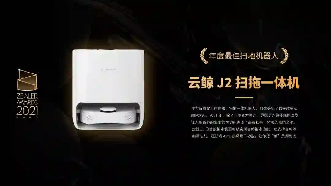 作为解放双手的神器,扫拖一体机器人,自然受到了越来越多家庭的欢迎。2021 年,除了洁净能力强外,更聪明的路径规划以及让人更省心的集尘集污功能也成了高端扫拖一体机的点睛之笔。云鲸 J2 的智能换水装置可以实现自动换水功能,还支持自动添加清洁剂,还新增 45℃ 热风烘干功能,让你把“懒”贯彻到底。
