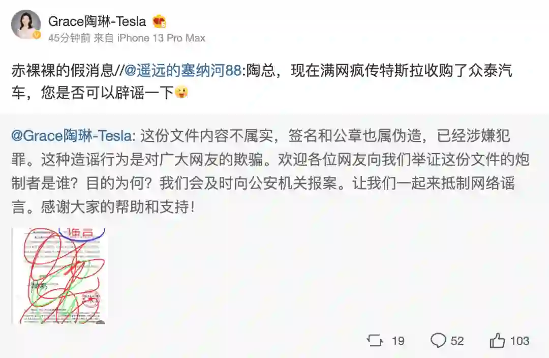 13日,针对网传特斯拉收购众泰汽车的消息,特斯拉全球副总裁陶琳在微博回应:赤裸裸的假消息。