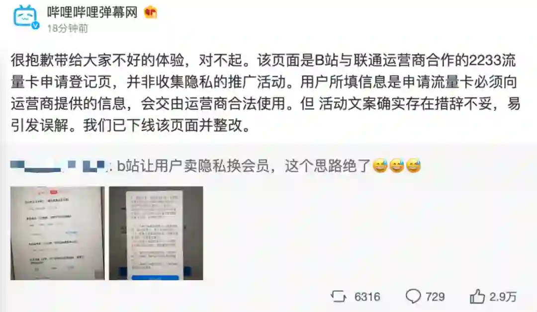 【B站回应“让用户卖隐私换会员”:措辞不妥已下线整改】