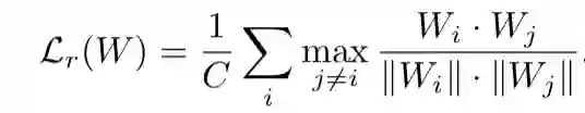 回归到作者提出的损失函数,作者从另一角度出发,不是增加类内的紧凑性,而是增加类间的分散程度。前文提到,在 angular softmax loss 中,权重向量 W_j 可以被视为所有 x_i 在 y_i = j 上的聚类中心。为了为了增加来自不同类的样本之间的角度距离,作者引入了正则化函数: