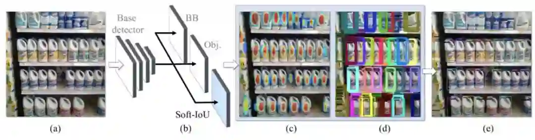 为了解决这类问题,作者提出了使用 Soft-IoU 层学习 Jaccard 指数,然后将 IoU 分数转换为高斯混合分布(MoG),利用期望最大化(EM)求解并将重叠检测合并为单一检测。下图图示了整个神经网络的运作流程。