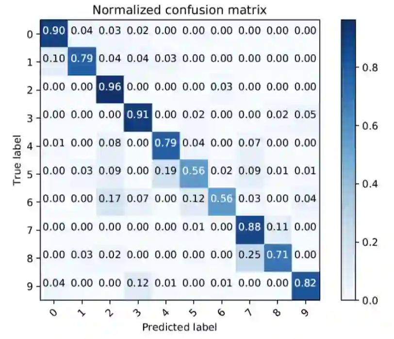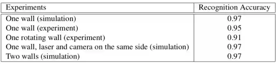 表中提供的结果有基于实验的,也有基于仿真的,为什么做出这样的选择作者没有做出解释。总体来说模型的准确率非常高,全部高于 90%,相对于目前手写数字识别准确率可以达到 99% 以上的表现也没有差很多。这里值得注意的是模型在实验设置 1、2、4 的模拟数据上表现完全一样,笔者本来期待的准确率是实验设置 1>2>4,因为光强度在经过墙壁漫反射后应该会降低,从而导致信噪比低得多,识别精度也应该相应降低。这里没有出现这种情况笔者猜测是实验环境比较理想,加上距离较近,在几次反射中也没有损失太多信息。