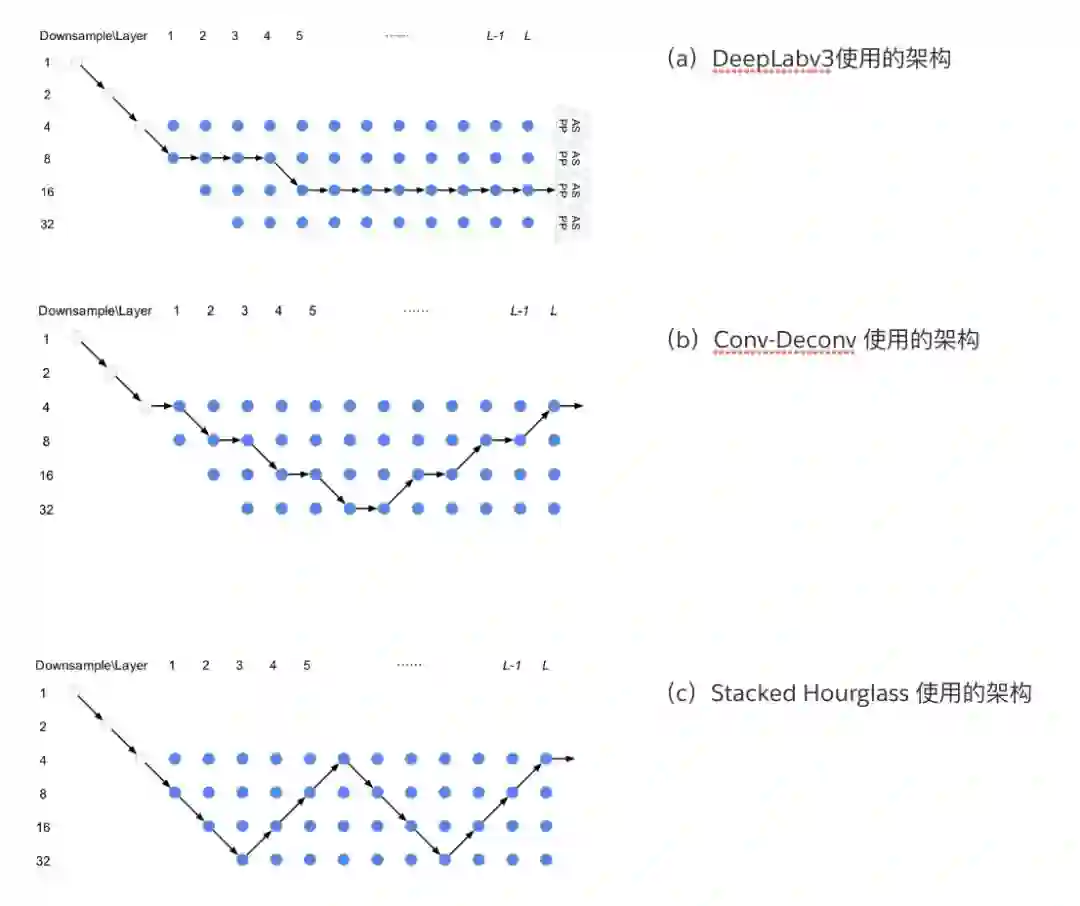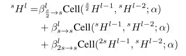 其中 s=4,8,16,32,即下采样倍数,l=1,2,...,L。因此,蓝色节点连接的三个箭头代表着该层之后神经网络应该下采样、维持分辨率不变或上采样,分别对应上式的三个部分。