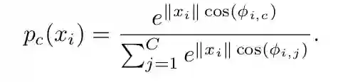 1(.) 是一个指标函数,当条件为真时值为 1,否则值为 0。y_i 为输入数据对应的标签,C 是标签类的数量。然后我们将偏置归零并归一化 W 的每一列以推导角度 Angular softmax loss,给定的向量 x_i 属于类 c 的 xi 的后验是: