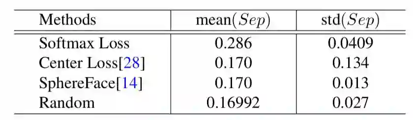 其中$\phi_{i,j}$是 W_i 和_Wj 之间的角度。理想情况下,聚类中心应该是均匀分布的,并且尽可能远离其他聚类中心,因此,cos 值应当较小。换句话说,Sep 的平均值和标准差应该尽可能小。下表列出了用不同损失函数训练的模型的定量比较。模型使用的网络和数据集都是一样的。