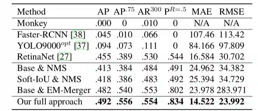 文章所提出的方法相较 faster-rcnn 和 yolo9000 在运行速度上仍然有明显的差距,不过其检测精度大大优于后两个网络。模型的 precision 和 recall 并没有比 RetinaNet 高很多,但 MAE 和 RMSE 小了很多,说明模型预测的每一个检测框几乎都更准确的检测到了目标(RetinaNet 有很多多余的检测框),在其后报告的计数任务上的表现也证明了模型在这方面的能力。
