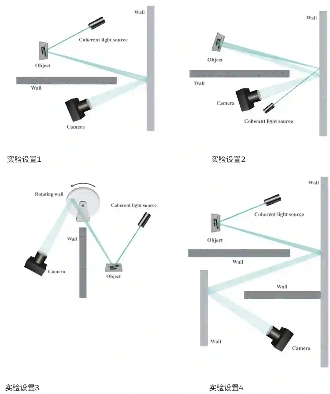 作者一共提供了 4 种实验情况,分别是 1. 以墙壁阻挡物体和相机之间的直接视线,激光位于物体一侧; 2. 以墙壁阻挡物体和相机之间的直接视线,激光位于相机一侧;3. 以旋转的墙壁阻挡物体和相机之间的直接视线,激光位于物体一侧;4. 以墙壁两次阻挡物体和相机之间的直接视线,激光位于物体一侧。见下图示意: