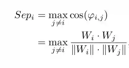 为了证明这一观点,作者使用将特征映射到标签置信度的分类矩阵 W ∈ R^{K×C} 来定量评估类间可分性。W_i 是 W 的第 i 列,其表示第 i 个标签类的权重向量,K 是特征向量的维度。则类间可分性可以定义为: