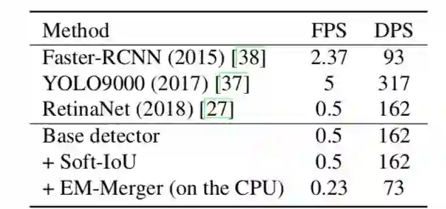 作者还对所提出的方法进行了 runtime 分析,与目前运行较快的目标检测神经网络进行了分析,表 2.1 中报告了每秒平均帧数(FPS)和每秒检测数(DPS)。基线方法是基于 RetinaNet 所以两者的运行时间是相同的,可以看到,添加 Soft-IoU 层不会影响表现。添加了 EM-Merger 单元后基线方法的 FPS 和 DPS 直接降低了一半,运行速度有明显下降,作者认为这是因为 GPU 和 CPU / RAM 之间需要进行内存交换,并且说明其 GPU 优化版本几乎与基线方法一样快,但文中并没有看到具体数据。