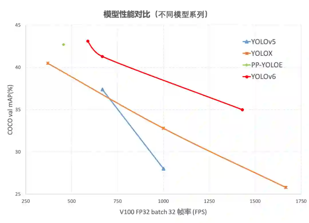 图 1-1 YOLOv6 各尺寸模型与其他模型性能对比
