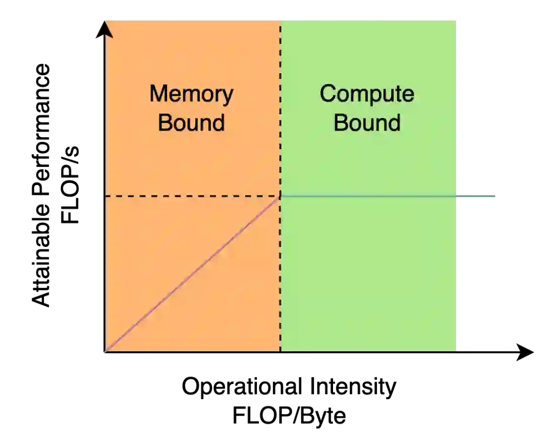 YOLOv5/YOLOX 使用的 Backbone 和 Neck 都基于 CSPNet[5] 搭建,采用了多分支的方式和残差结构。对于 GPU 等硬件来说,这种结构会一定程度上增加延时,同时减小内存带宽利用率。下图 2 为计算机体系结构领域中的 Roofline Model[8] 介绍图,显示了硬件中计算能力和内存带宽之间的关联关系。