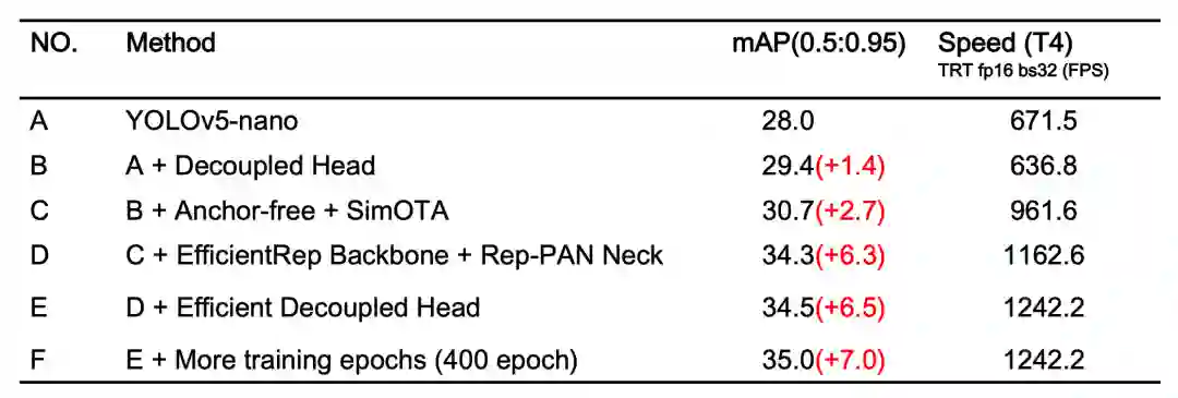 经过以上优化策略和改进,YOLOv6 在多个不同尺寸下的模型均取得了卓越的表现。下表 1 展示了 YOLOv6-nano 的消融实验结果,从实验结果可以看出,我们自主设计的检测网络在精度和速度上都带来了很大的增益。