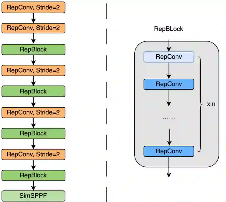 EfficientRep Backbone:在 Backbone 设计方面,我们基于以上 Rep 算子设计了一个高效的 Backbone。相比于 YOLOv5 采用的 CSP-Backbone,该 Backbone 能够高效利用硬件(如 GPU)算力的同时,还具有较强的表征能力。下图 4 为 EfficientRep Backbone 具体设计结构图,我们将 Backbone 中 stride=2 的普通 Conv 层替换成了 stride=2 的 RepConv 层。同时,将原始的 CSP-Block 都重新设计为 RepBlock,其中 RepBlock 的第一个 RepConv 会做 channel 维度的变换和对齐。另外,我们还将原始的 SPPF 优化设计为更加高效的 SimSPPF。