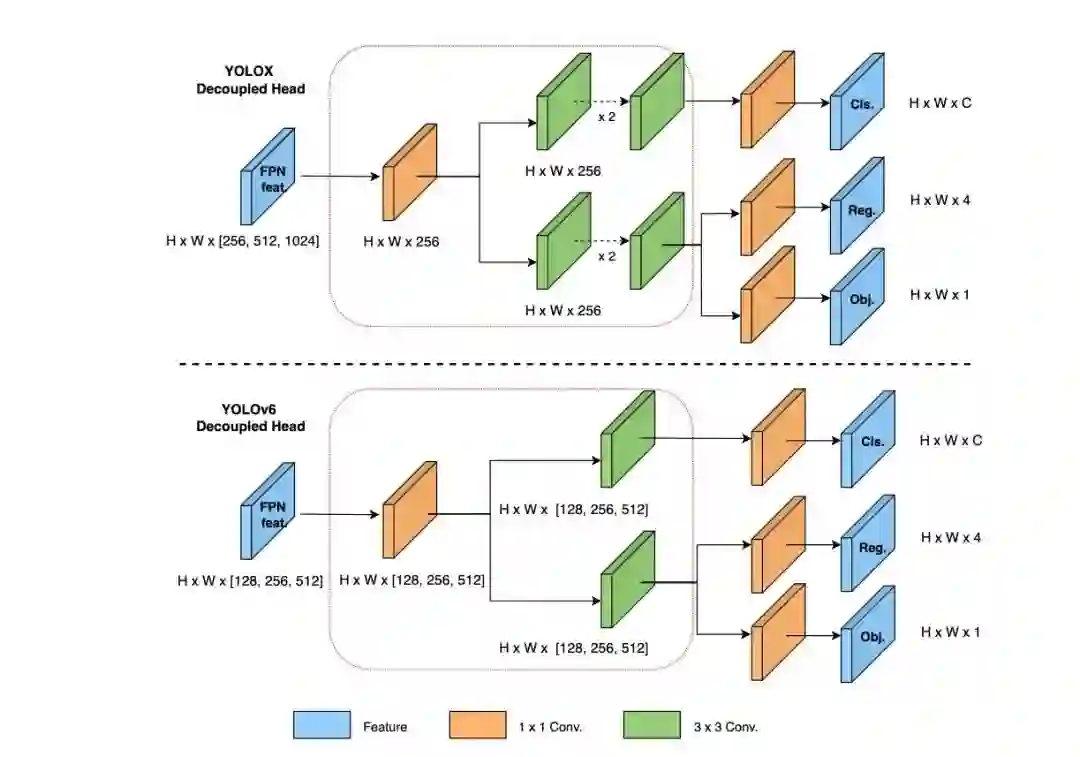 在 YOLOv6 中,我们采用了解耦检测头(Decoupled Head)结构,并对其进行了精简设计。原始 YOLOv5 的检测头是通过分类和回归分支融合共享的方式来实现的,而 YOLOX 的检测头则是将分类和回归分支进行解耦,同时新增了两个额外的 3x3 的卷积层,虽然提升了检测精度,但一定程度上增加了网络延时。因此,我们对解耦头进行了精简设计,同时综合考虑到相关算子表征能力和硬件上计算开销这两者的平衡,采用 Hybrid Channels 策略重新设计了一个更高效的解耦头结构,在维持精度的同时降低了延时,缓解了解耦头中 3x3 卷积带来的额外延时开销。通过在 nano 尺寸模型上进行消融实验,对比相同通道数的解耦头结构,精度提升 0.2% AP 的同时,速度提升 6.8%。