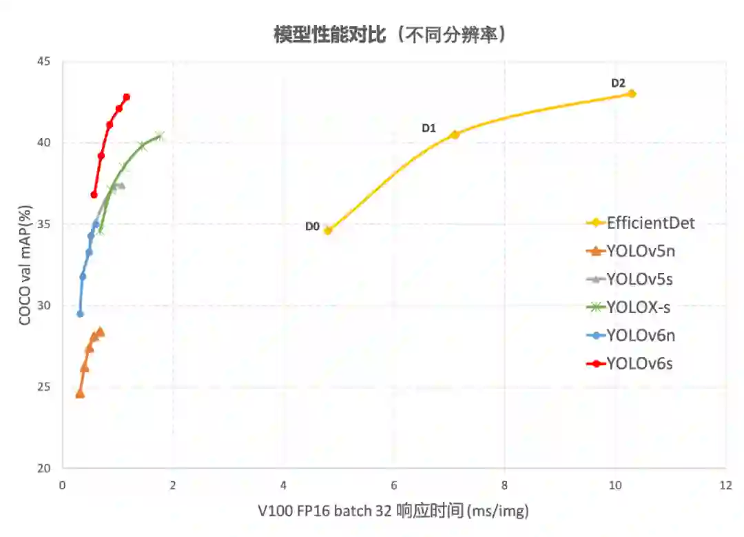 图 1-2 YOLOv6 与其他模型在不同分辨率下性能对比