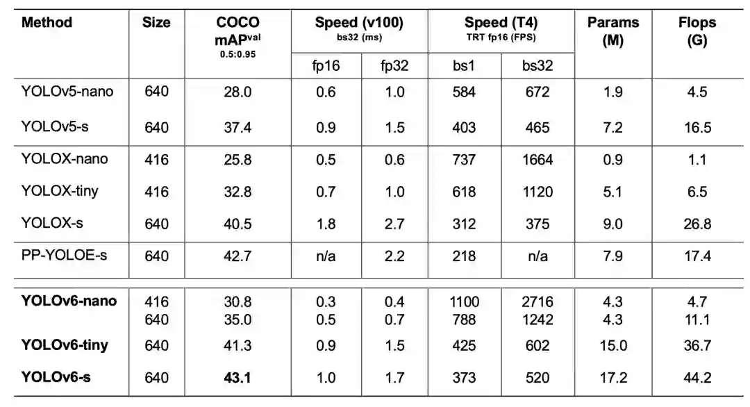YOLOv6-tiny 在 COCO val 上 取得了 41.3% AP 的精度, 同时在 T4 上使用 TRT FP16 batchsize=32 进行推理,可达到 602FPS 的性能,相较于 YOLOv5-s 精度提升 3.9% AP,速度提升 29.4%。