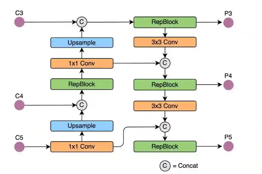 Rep-PAN:在 Neck 设计方面,为了让其在硬件上推理更加高效,以达到更好的精度与速度的平衡,我们基于硬件感知神经网络设计思想,为 YOLOv6 设计了一个更有效的特征融合网络结构。Rep-PAN 基于 PAN[6] 拓扑方式,用 RepBlock 替换了 YOLOv5 中使用的 CSP-Block,同时对整体 Neck 中的算子进行了调整,目的是在硬件上达到高效推理的同时,保持较好的多尺度特征融合能力(Rep-PAN 结构图如下图 5 所示)。