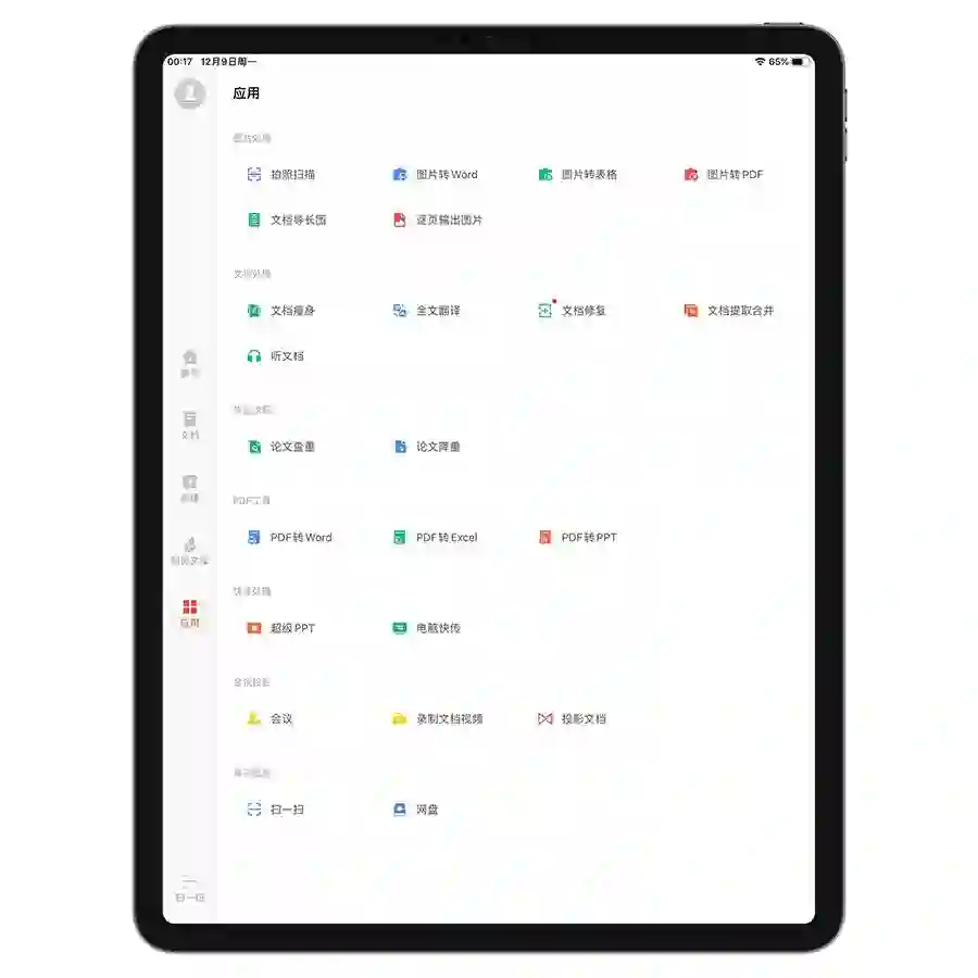 除了能够满足我们基础的文档表格 PPT 编辑功能外,它还有拍照扫描、图片转 Word、Excel、PDF 或者 PDF 转 Word、Excel、PPT 等功能,比较贴合我们的日常使用需求。