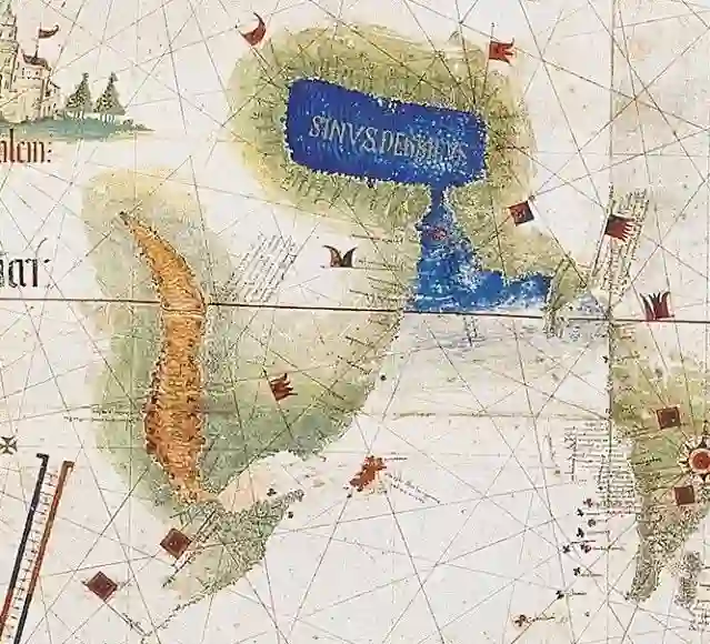 从图上可以看出,沿着左下方非洲大陆西海岸,有一条通畅的水道,由此一直南下将会抵达通往印度洋的入口。这样一条潜在的航道无疑对恩里克王子产生极大的诱惑。向南,向南,成了新崛起的葡萄牙海上帝国的进军口号。