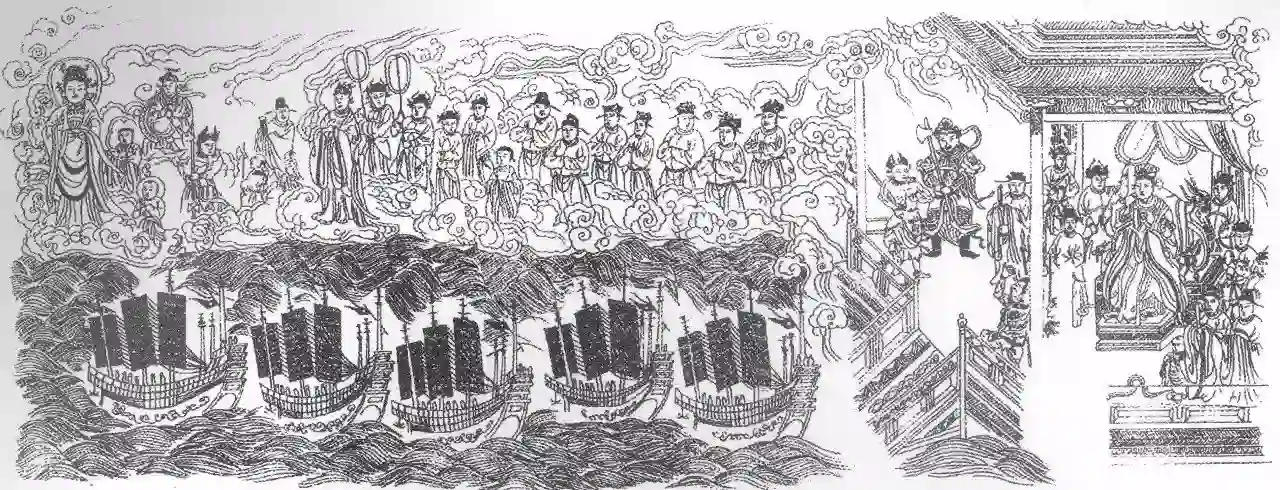 下面是依照《中国美术全集》临摹复原的线图,原为六开相连的长幅,画面右端是端坐在宫中的天妃,左端站立者是观音菩萨,她们中间则有很多侍女、道童以及文武官员。画面下方可以看见五艘海船,在波涛汹涌的洋面上破浪前行。专家推测此图中的船,“艏艉高翘,船舷高,吃水深,正符合福船的特征……此图可作为宝船系福船型这一结论的有力证据。画中,那开阔海面上,成列、成行的船队,也为我们描绘了郑和下西洋气势磅礴的景象。”