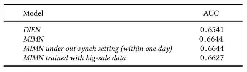 MIMN 算法是由两部分组成,一部分是用户兴趣提取,一部分是 CTR 预估,在线计算会涉及到 UIC 和 RTP 两组服务。因此会存在模型参数同步的问题,在表三中我们做了相关实验,证明 UIC 和 RTP server 模型参数相差一天,对于模型离线效果无影响。我们系统是采用增量训练的方式,每小时就会更新模型参数,会大幅降低参数不一致风险。