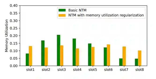 为了有效提高 memory 利用率,在 NTM 的基础上,我们加入了 Memory Utilization regularization 的考虑,希望约束不同 memory slot 中的写入方差。NTM 使用基于内容的寻址方式,会导致部分的 slot 写入利用率很低 ( 定义为:累计的写入权重 ),如图10所示,绿色的柱条是亚马逊数据集使用原始的 NTM 得到的各 slot 的利用率,可以看出最后两个 slot 利用率都很低,线上使用36个 slot 的时候部分 slot 利用率很低的现象更为严重。