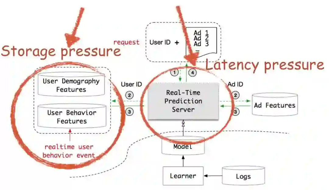 图4展示的是在线 RTP 引擎,当一个 request 过来的时候,会打分大概400个广告,我们根据 Ad ID 去 Ad Feature 这个索引库里面提取广告特征,根据 User ID 去提取 User 的 Demography 特征以及行为序列特征,然后送入模型进行打分,排序后将广告返回给用户。点击率预估与大部分工业应用一样需要一个实时的响应。在阿里这个电商平台里,点击率预估系统不仅面临高并发的请求,还需要在一个极短的时间内进行响应。我们的 DIN 和 DIEN 模型由于原始序列和 Target 均有显式交互,因而无法解耦计算,当行为序列长度为100时,DIN 和 DIEN 现有的复杂度逼近计算极限,由于计算资源的约束,在现有的模型下想把行为序列往1000扩展是不可能的。另外一方面,用户的行为特征是存储在线上服务引擎,阿里有亿级的用户,如果每个用户存储的行为序列特征由100扩展到1000,将带来极大的存储消耗和模型服务 IO 问题。因此我们面临着延迟约束和存储限制的系统瓶颈。