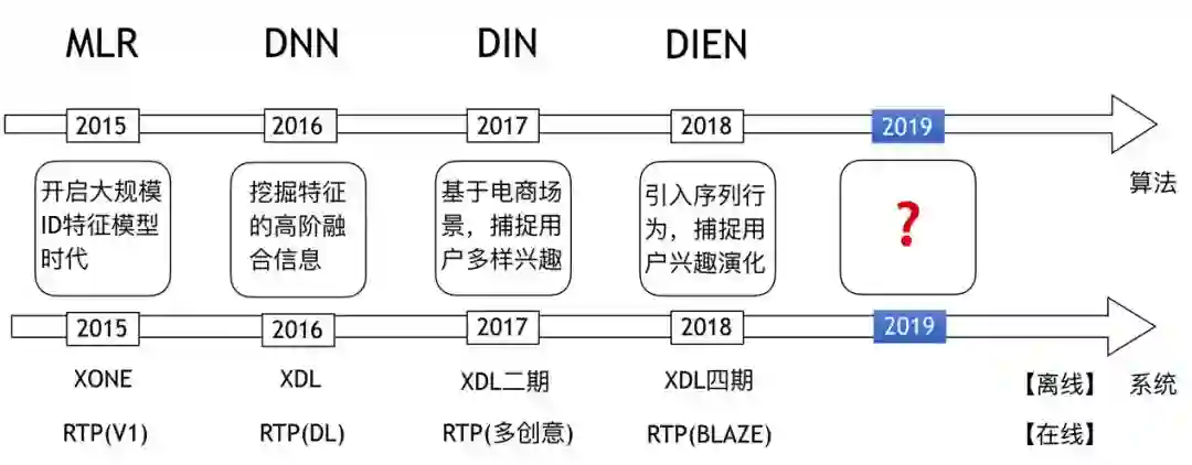 阿里妈妈定向技术团队技术迭代的路线如图2所示。在2015年的时候从 LR 升级到了分片线性模型 MLR,开启了大规模 ID 特征模型时代;2016年引入 DNN 模型,利用深度学习挖掘特征的高阶融合信息;2017年提出了 DIN 模型,通过引入序列信息,基于电商场景,捕捉用户的多峰兴趣;2018年创造出了 DIEN 模型,通过 GRU 时序结构,引入序列行为,捕捉用户兴趣的演化。每一次技术创新的背后都是在挖掘数据的价值。与此同时,每次技术创新的背后都有系统服务升级的支持,训练引擎从 XONE 升级到 XDL 一期、二期、四期,在线服务引擎也从 RTP 的1.0版本逐步升级到高性能 RTP 的 BLAZE 版本。可以总结出整体的技术发展思路是:数据价值的挖掘推动算法模型的创新,而算法模型的创新又推动了系统服务的升级。按照这样的思路,2019年进行的技术迭代就是用户长期兴趣的挖掘。