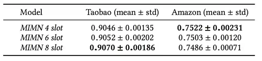 另外还可以对容量进行分析。MIMN 中 memory 的数量可以任意定义,但是它的效果并不是随着 memory 的增长线性增长的。在淘宝数据集和亚马逊数据集上,最优的 memory slot 数量分别是8个和4个,因为我们能处理的行为序列长度和最优的 slot 个数是存在关联关系的,当行为序列较短的时候,例如亚马逊数据集,往上扩 slot,并不能带来效果提升。