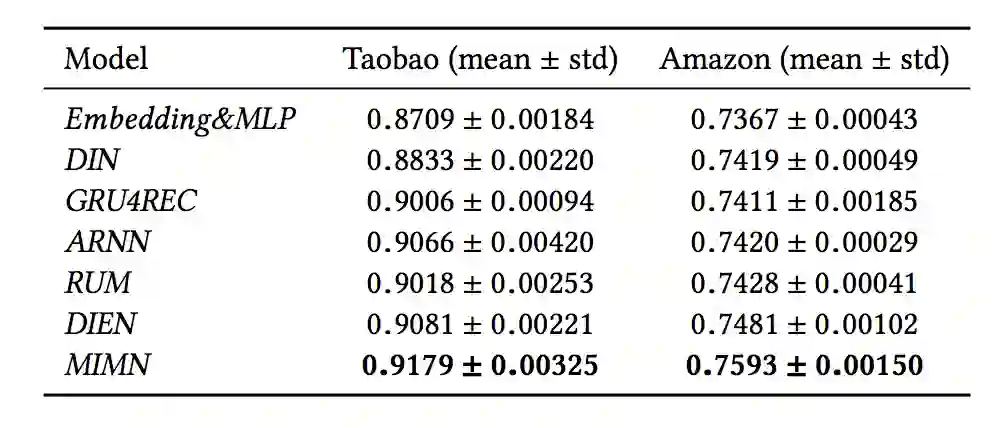 我们采用了亚马逊以及淘宝的公开数据集来进行实验,对比的模型有:Embedding & MLP、DIN、GRU4REC、ARNN、RUN、DIEN,从表1可以看到在这两个数据集上的效果 MIMN 模型都优于对照的模型。