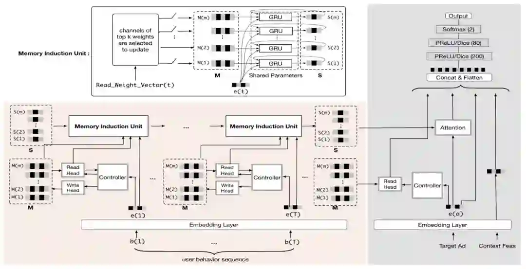 在介绍算法创新之前,首先介绍记忆网络。记忆网络主要有 facebook 的 Memory Network ( 和 attention 模型类似 ) 以及 Google 的 Neural Turing Machines:NTM ( 它引入的是 external memory,显式对行为序列进行存储,帮助建模长期依赖 ) 两种。NTM 相比 LSTM 和 GRU 更适合建模长期序列,后两者随着序列的增长存在梯度弥散等问题。记忆网络的优势包括:适合建模长期依赖;Memory 向量的存储避免直接存储长期行为序列,缓解存储压力;Memory 的读操作相比 GRU+Attention 减小了计算压力。
