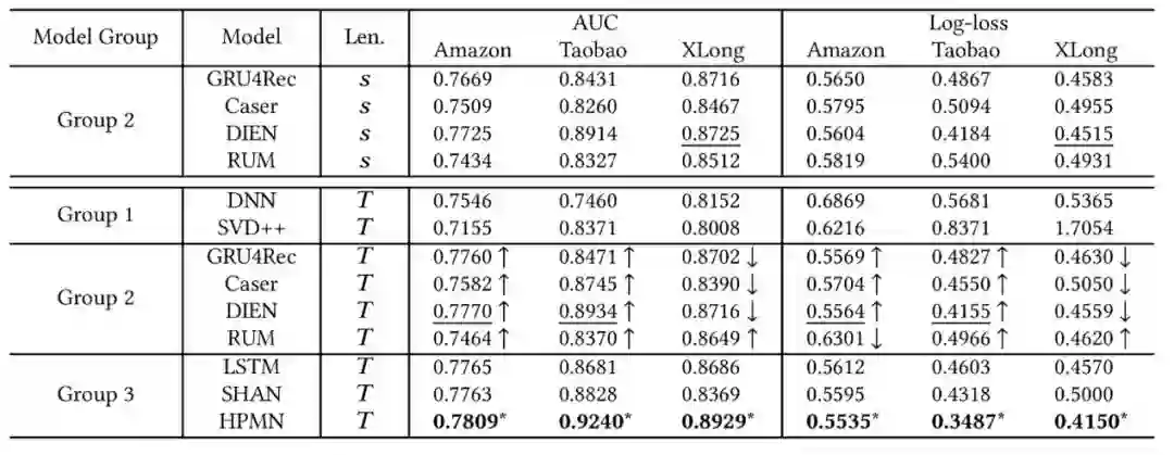 HPMN 模型的效果如表3所示,实验做了两个对比,上面的 s 指的是一个短序列,下面的 T 指的是长期行为序列,s 只做了 group 2 的实验对比,说明当我们把行为序列扩长,会带来明显的增益,另外 HPMN 在长期行为序列下对比其他模型也是有明显的效果提升。
