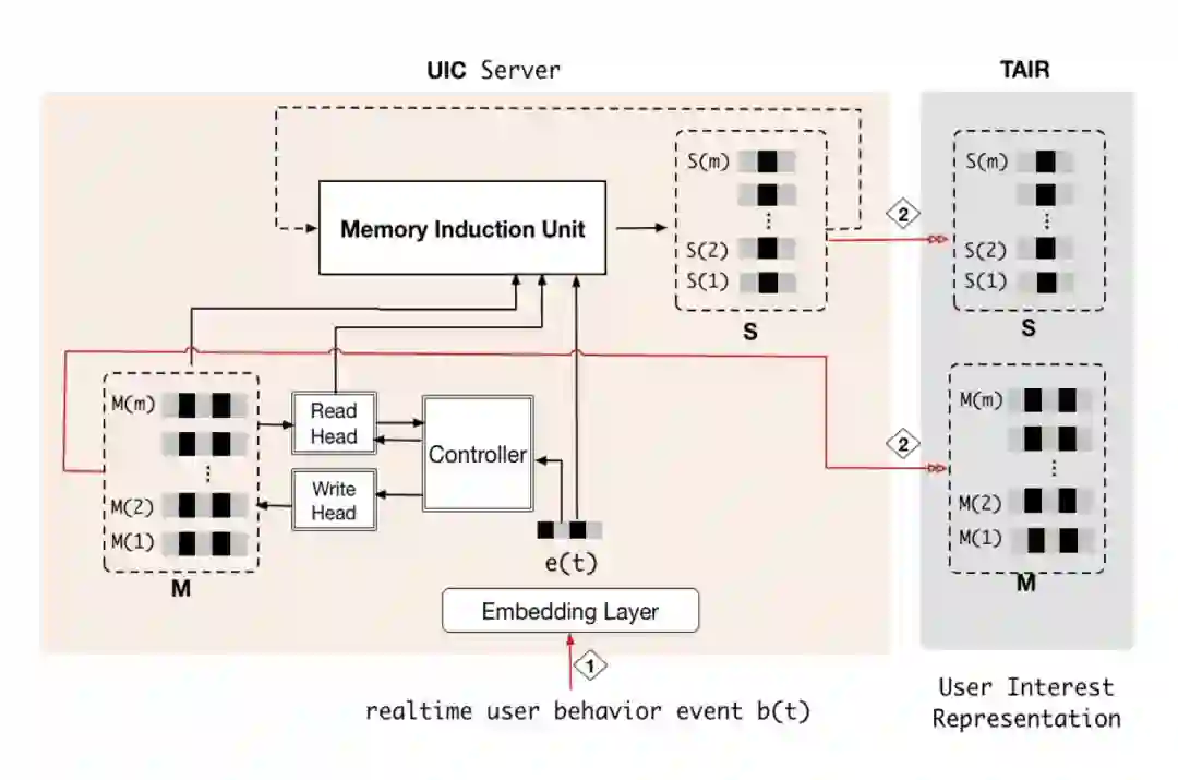 MIMN 的在线实现如图13所示,时序模块存放在 UIC 系统中,当有个新的用户行为时,会通过 Controller 实时更新用户的 memory 向量,并通过 memory induction unit 来更新 channel 演化向量,然后将这两组向量存放在 TAIR 以供线上实时请求系统应用。