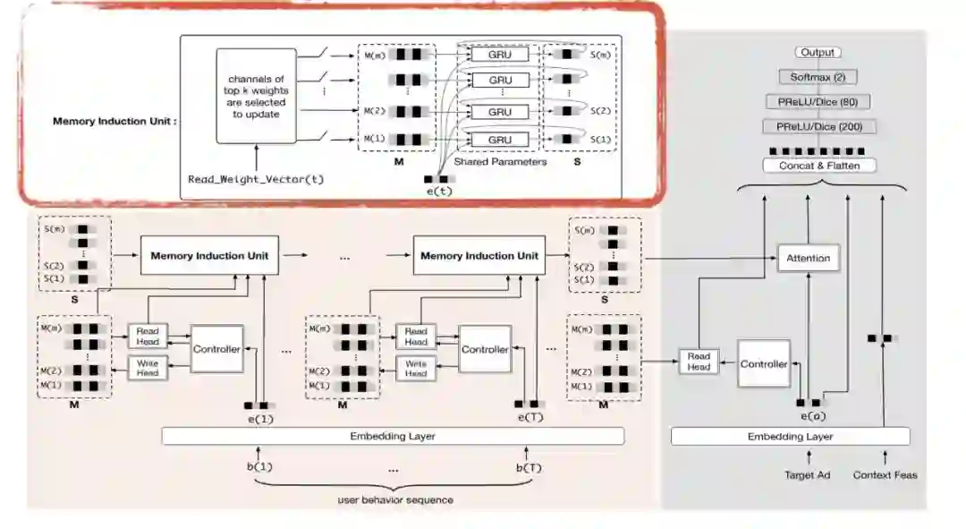 NTM 算法 memory 通常用来存储原始数据信息,遗失了对于更高阶的信息的捕捉。为了能更好捕捉用户兴趣,MIMN 设计了 Memory Induction Unit ( MIU ) 来捕捉用户兴趣演化。