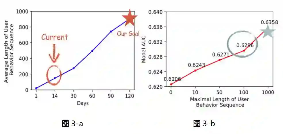 在谈长期兴趣挖掘的价值之前,得先看看目前团队建模能力的现状,首先 DIN 模型与 DIEN 模型都通过用户的历史行为挖掘用户兴趣,其中 DIN 模型对用户的原始行为序列进行 attention 操作,获取用户相关的兴趣,进行用户的点击率预估,而 DIEN 模型是通过 GRU 对用户原始行为序列进行时序的建模,但是由于一定的系统瓶颈,可以处理的最大历史行为长度为100。从图 3-a 可以看出历史行为长度100仅对应用户14天的行为,当用户行为窗口增加到120天时,用户历史行为长度爆炸到了1000。为了看出长期历史行为的价值,我们做了简单的实验来评估不同长度用户行为引入 CTR 预估模型后的离线表现,我们采用 DNN 模型,把行为序列特征 ( 包括用户点击的 item 以及 item 的属性特征等 ) 进行简单的 embedding sum 之后输入模型,如图 3-b 所示,利用1000长度用户行为信息相比100长度,能够带来 0.6% GAUC 的提升。这里采用的 GAUC 是以用户粒度为 group 计算的 AUC,然后根据用户的 frequency 进行 weight sum。其中0.6%离线提升对在线业务有重大意义,由此可见长期历史行为具有显著的利用价值。