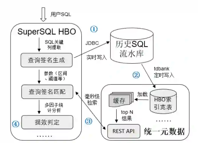 3. 历史检索:基于查询签名的完全匹配(exact match),调用统一元数据服务的 REST API,返回最近历史区间(如一周)内的索引宽表记录集。SuperSQL 通过不同的 API 入参,指定返回记录集的最大行数、起止日期、超时时间等属性,确保检索的实时性能(平均 < 100ms)。